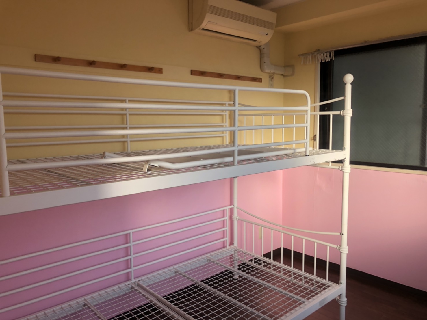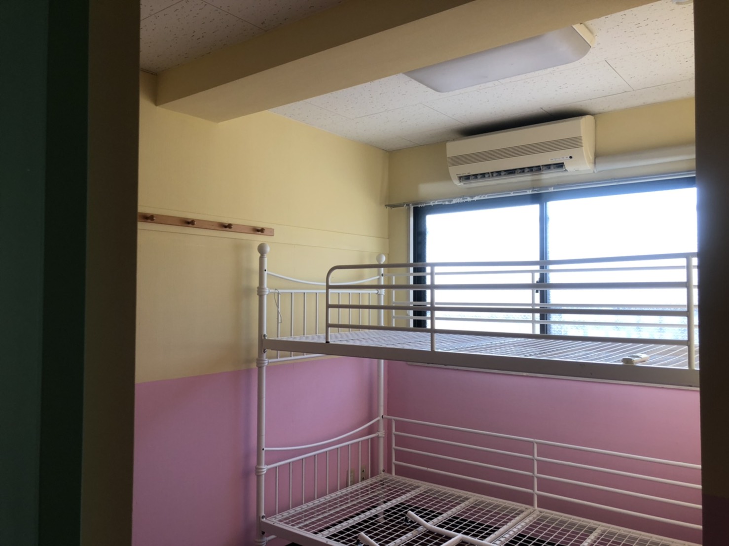 各部屋には 二段ベッド・机・椅子・エアコン完備